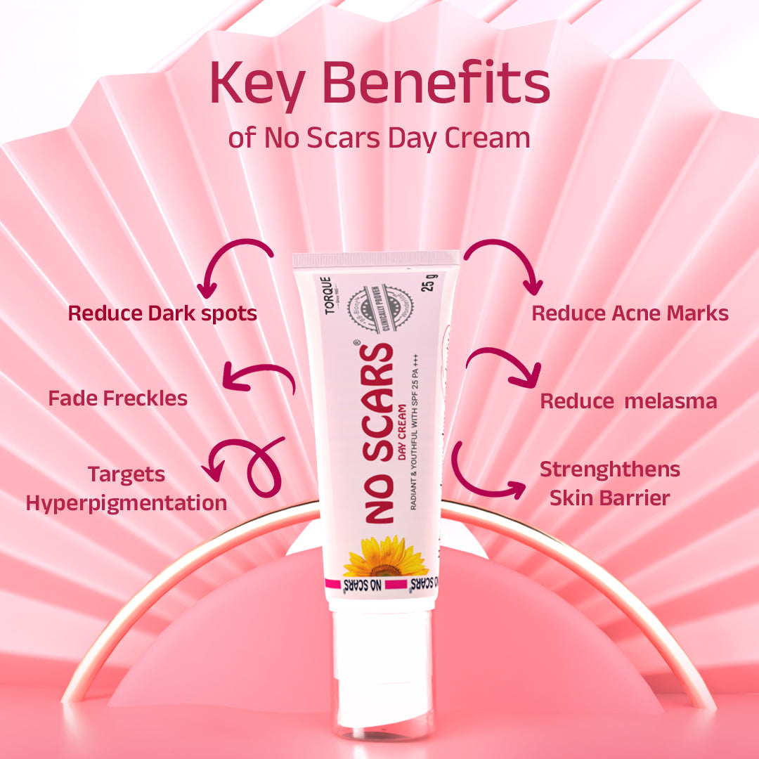 - No Scars Day Cream helps reduce freckles, post-inflammatory spots, and acne marks.